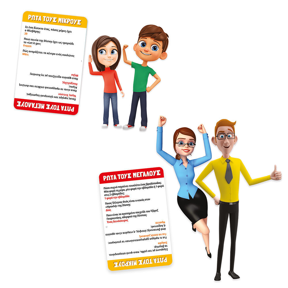 Ποιος θα τα καταφέρει σε αυτή τη μεγάλη οικογενειακή αναμέτρηση; Οι μικροί θα ενώσουν τις δυνάμεις τους για να κερδίσουν τους μεγάλους, στο πιο διασκεδαστικό παιχνίδι γνώσεων! Παιδιά, σε ποια χώρα εφευρέθηκαν τα κρουασάν, που τόσο πολύ σας αρέσουν; Γονείς, πώς ονομάζονται οι 2 αδερφές στην ταινία Frozen;