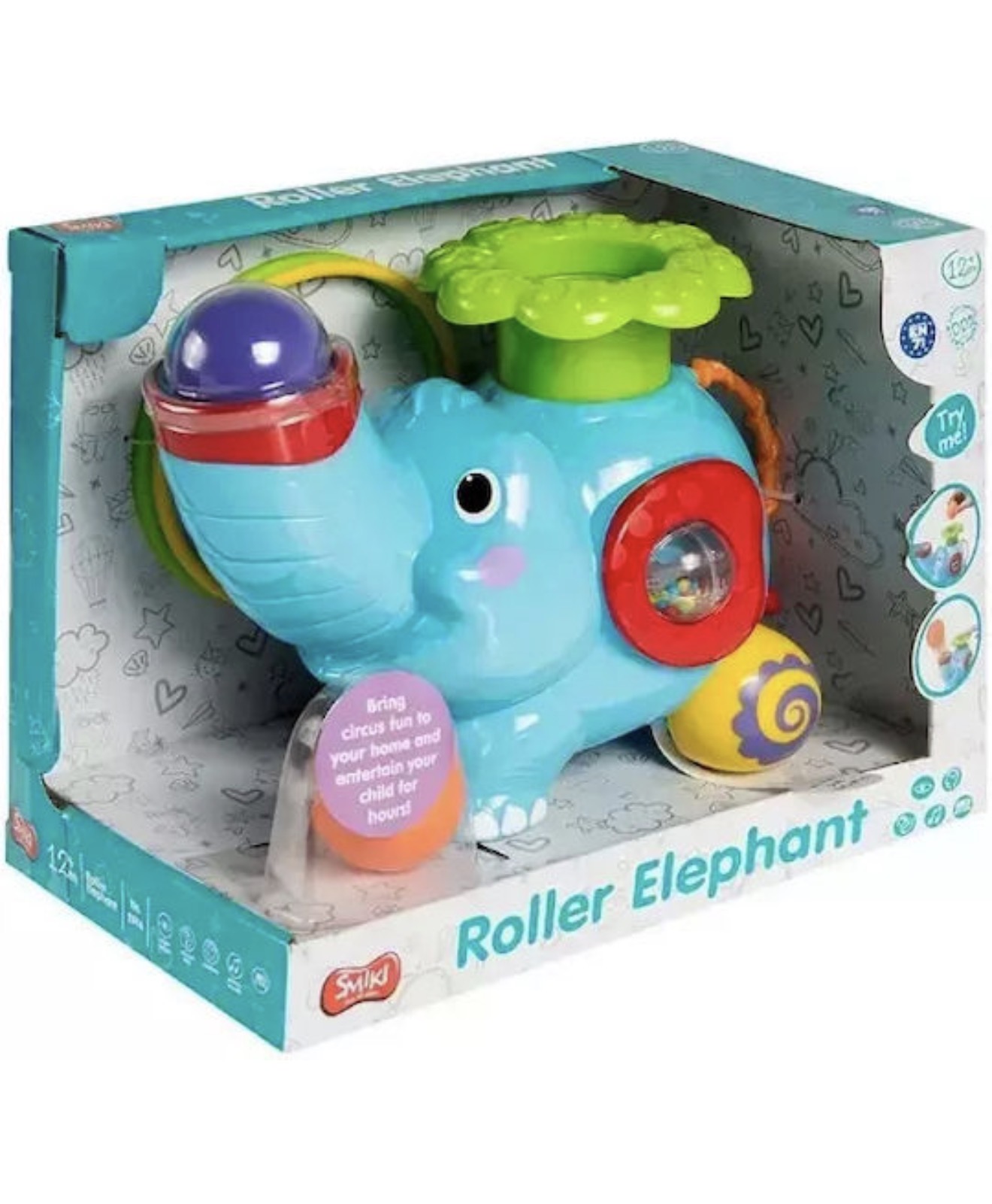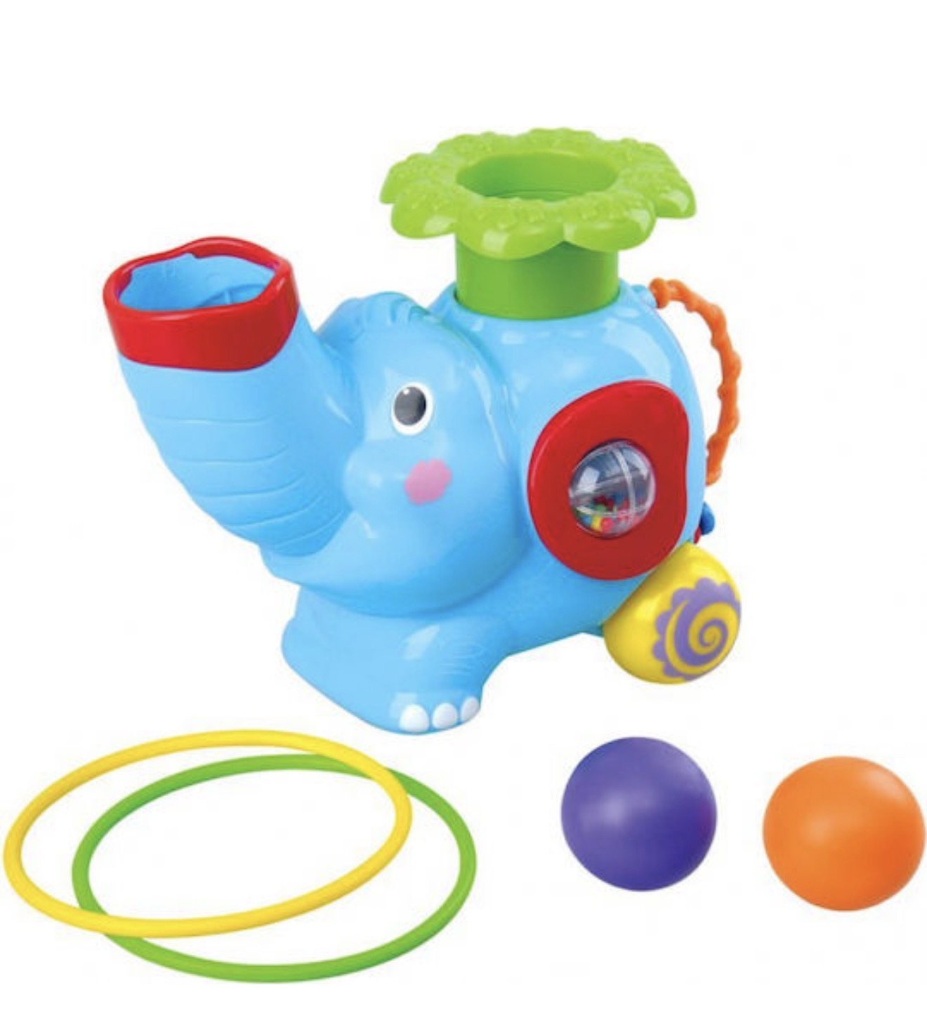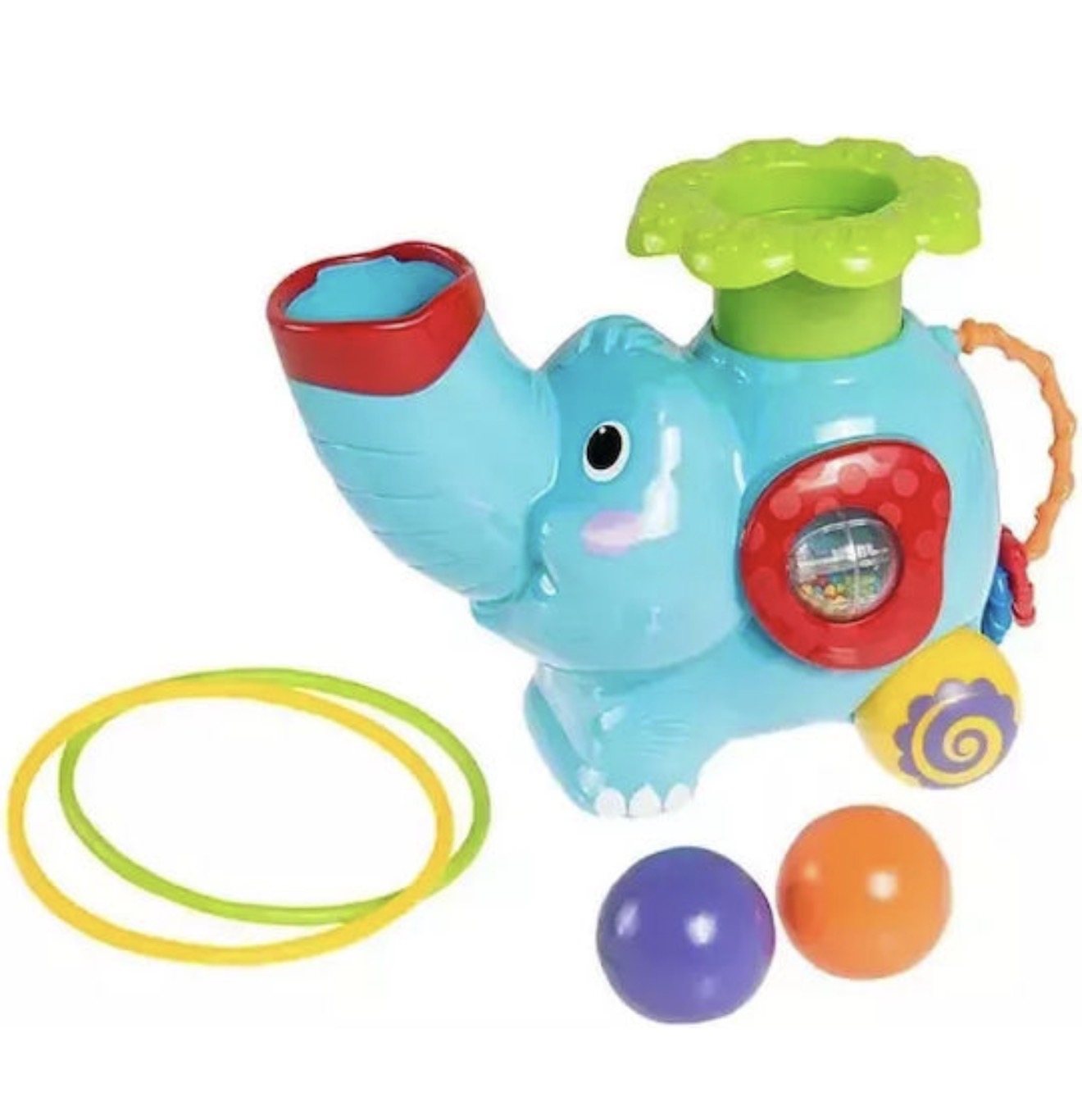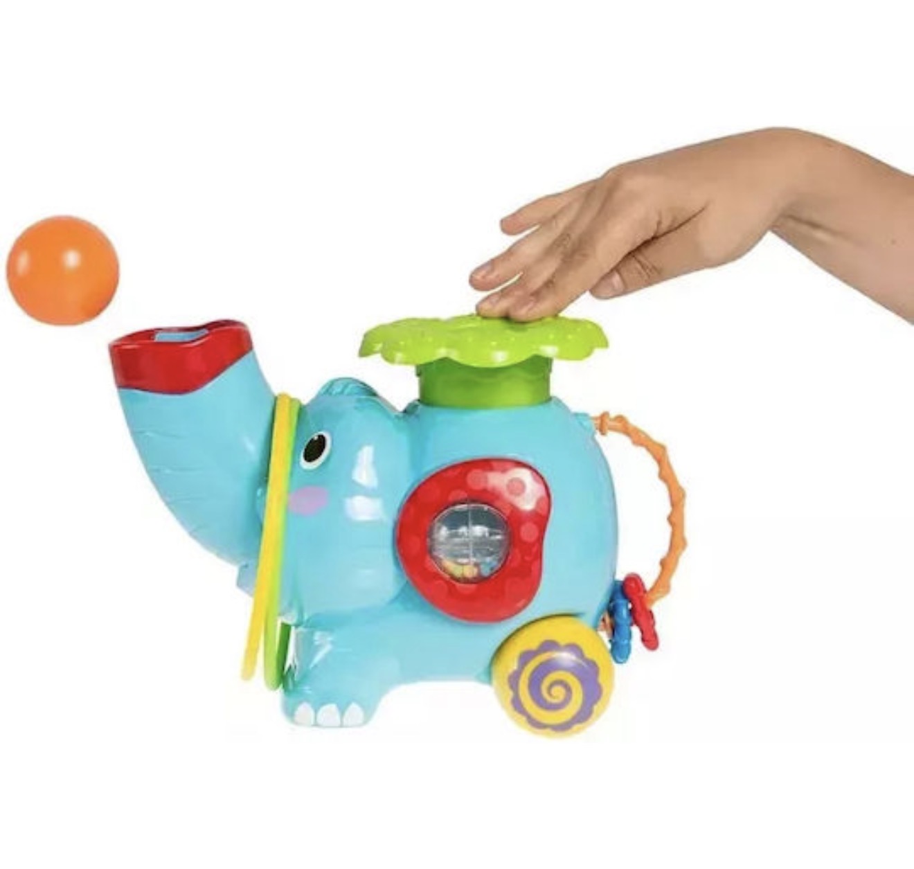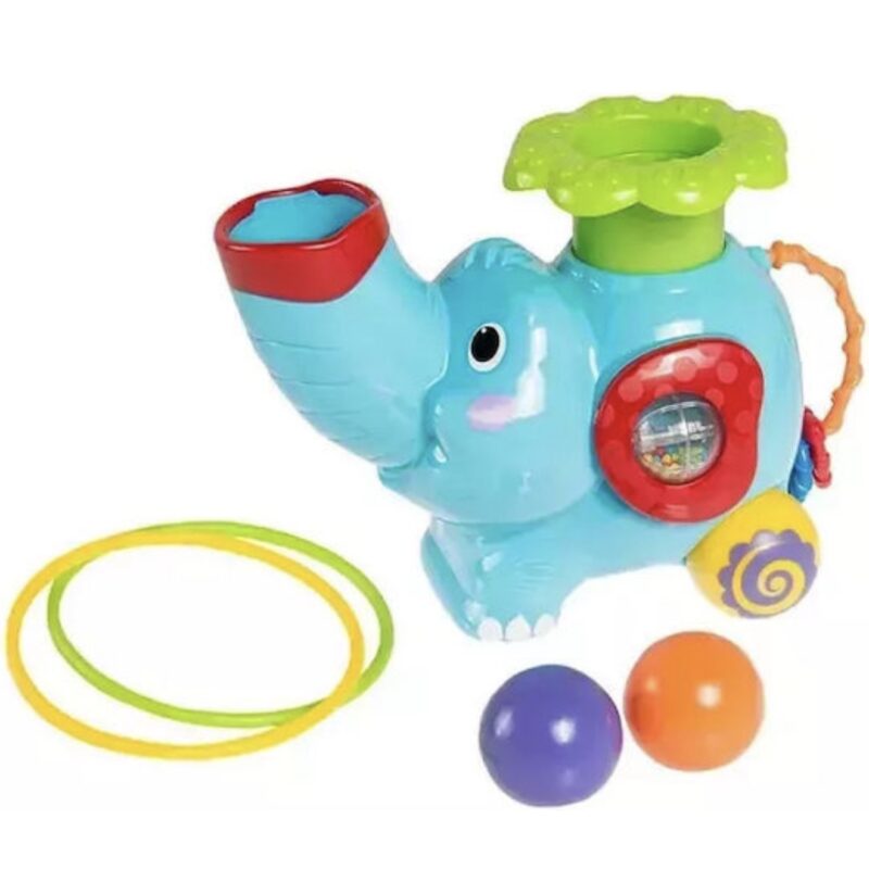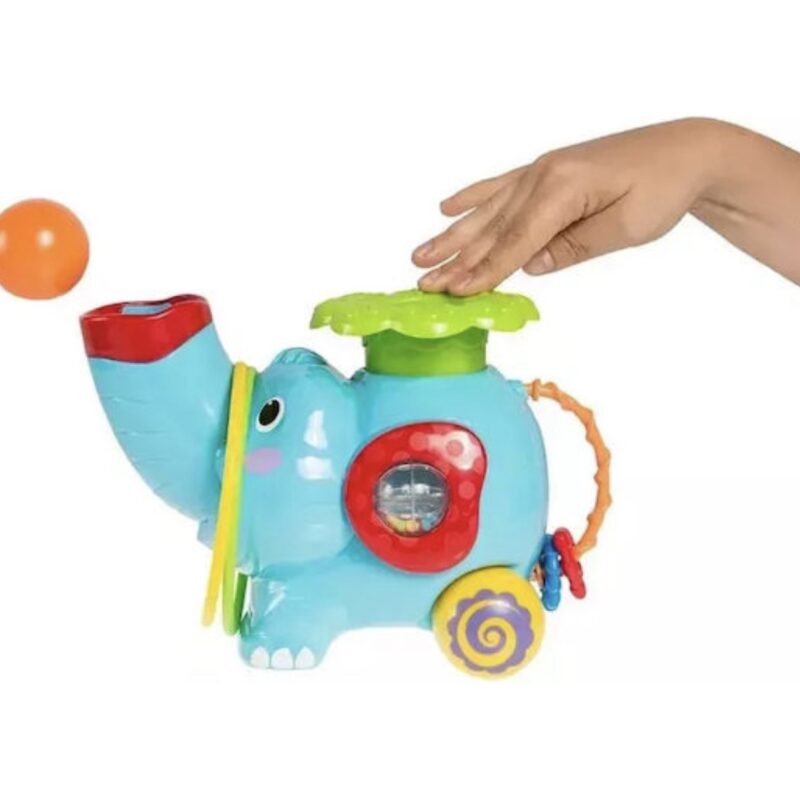 Σπρώξτε την πλάτη του ελέφαντα προς τα κάτω και δείτε να εκτοξεύει μια μπάλα, πετάξτε ένα στεφάνι γύρω από την προβοσκίδα του ή παρακολουθήστε το να κυλα στα rollers του με μουσική.